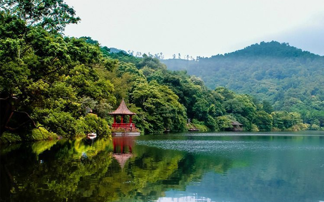 Xung quanh hồ sẽ là những tán cây với những chiếc lá nhiều màu sắc in bóng xuống phía dưới mặt hồ, tất cả tạo nên một bức tranh đầy màu sắc và không kém phần sinh động. Tuy bao phủ mặt hồ là một màu xanh của lá cây, nhưng du khách du lịch Trung Quốc khi đi đến nơi đây sẽ thấy được điểm đặc biệt là những lá cây đều có đốm màu xanh đậm và thậm chí là du khách có thể nhìn rõ đáy hồ bởi nước ở nơi đây có chứa calcium carbonate và hydrophyte tạo nên độ trong. Đây cũng là nơi được đánh giá là cảnh đẹp thế giới hiện nay.
