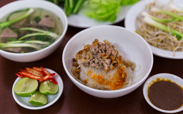 Goi là món phở hai tô vì có một tô phở trộn cùng thịt bằm, hành phi, ớt xay, cà rốt, tô còn lại chính là nước lèo như ăn phở ngoài Bắc có thịt bò, bò viên. Mới nhìn thì sợi phở khô ai cũng nghĩ đây là sợi hủ tiếu của miền Nam nhưng nó khác ở chỗ sợi phở này được làm từ gạo nguyên chất nên khi trần lên sẽ không bị dính sợi vào nhau hay bị bón cục, sợi phở săn lại, khi đảo đều lên sẽ không bị nát và ăn hơi dai. Bát nước lèo thì trong veo có vị thanh ngọt vì được ninh từ xương heo và bò, thêm ít hành lá màu xanh, vài miếng thịt bò, bò viên.